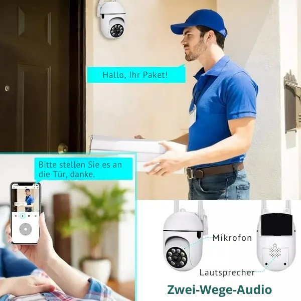 Das integrierte, empfindliche Mikrofon der Außensicherheitskamera erlaubt es dir, alles über die App zu hören – und auch zu sprechen. Zwei-Wege-Audio ermöglicht dir die Kommunikation mit willkommenen Freunden und der Bewegungserkennungs-Alarm wird für dich unerwünschte Gäste oder Tiere los.