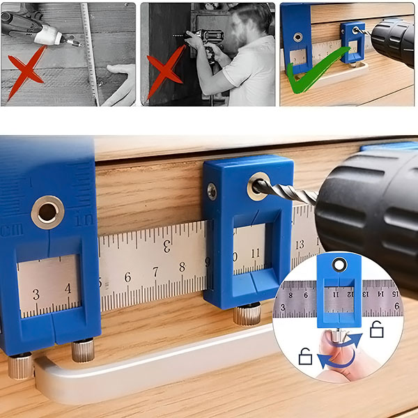 Mit einem verstellbaren Lineal, das schnelle Messungen und einfache Anpassungen ermöglicht, können Sie die Bohrpunkte problemlos positionieren. Egal, ob Sie mit Holz, Metall oder Kunststoff arbeiten, die verschiebbaren Markierungen und die Millimeterskala machen die Positionierung zum Kinderspiel.