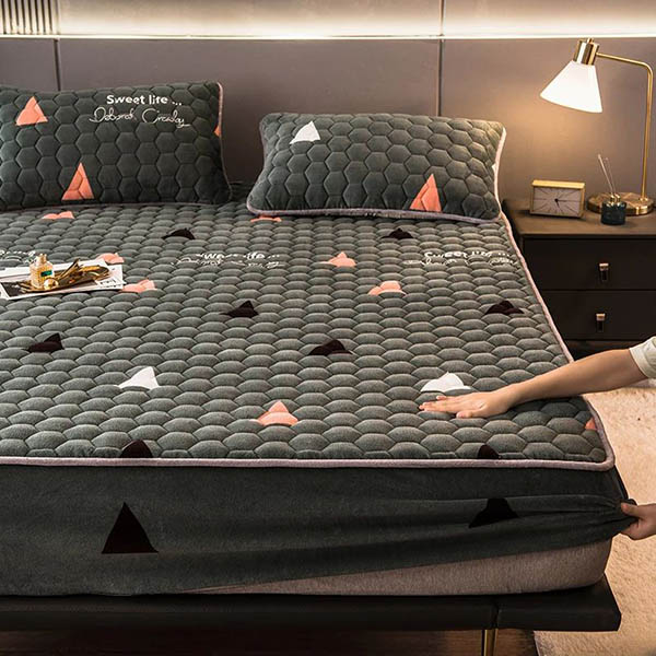 Verschönern Sie Ihr Schlafzimmer mit stilvollen Designs. Wählen Sie zwischen grau-grün mit Dreiecken oder rosa mit Herzen, um Ihren persönlichen Stil zu unterstreichen.